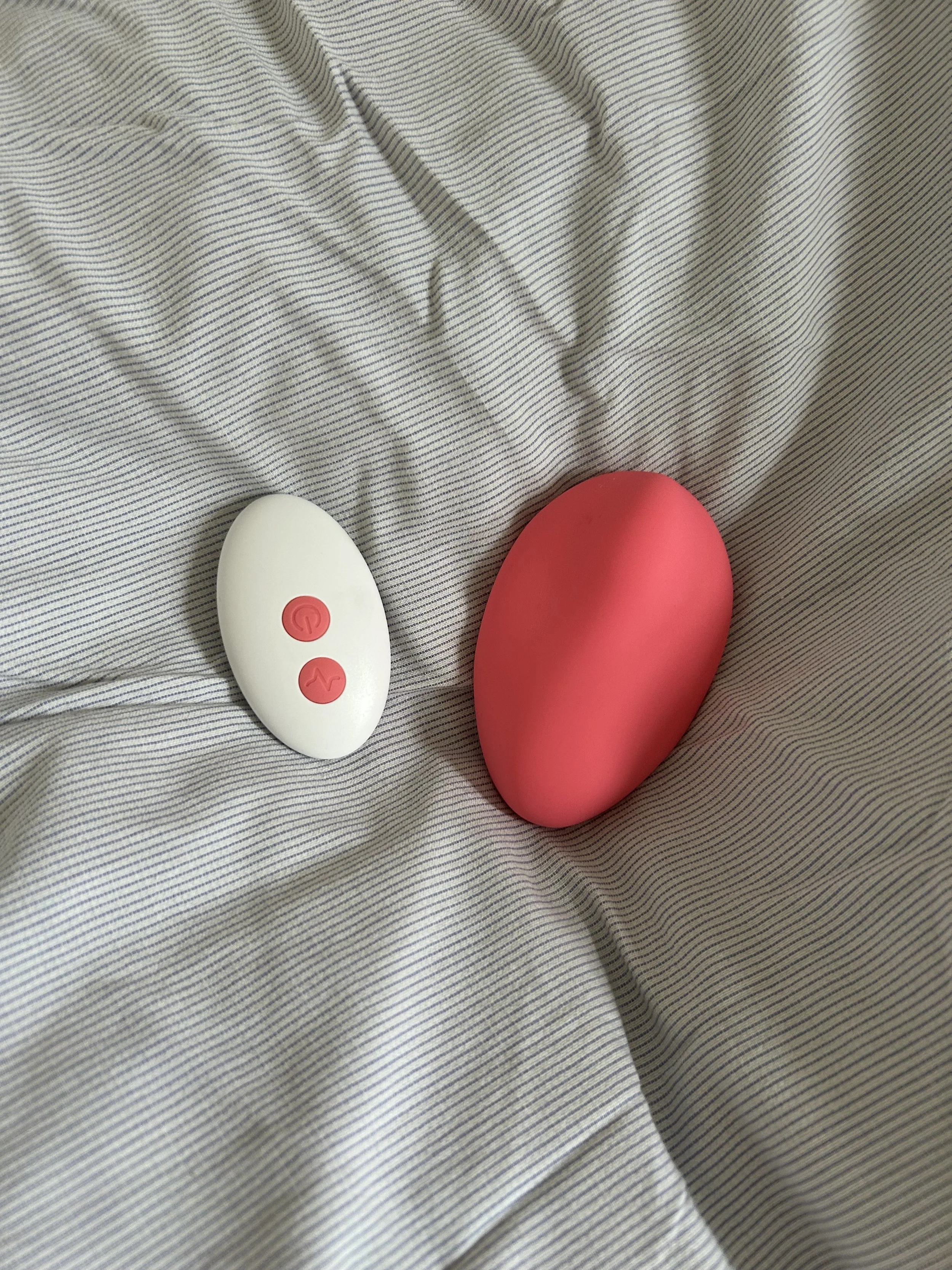 I pakken ligger også en lille hvid fjernbetjening med røde knapper. “Smart”, er min første tanke. “Så kan ens partner kontrollere styrke og intensitet, mens man holder om vibratoren”.
